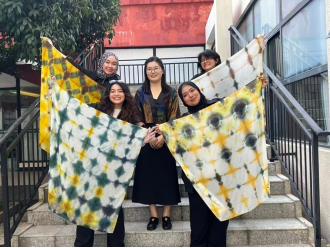 图3:周倩老师组织刺植物染活动体验现场及外宾成果展示